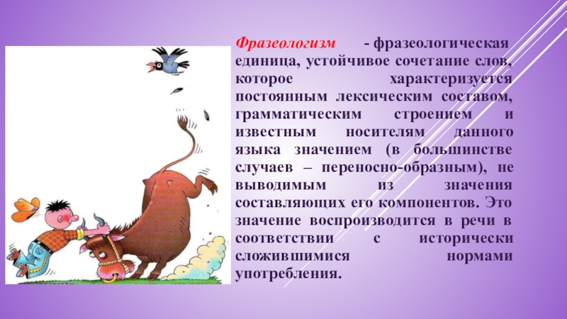 грамматическим строением и известным носителям данного языка значением (в большинстве случаев – переносно-образным), не выводимым из значения составляющих его компонентов. Это значение воспроизводится в речи в соответствии с исторически сложившимися нормами употребления.