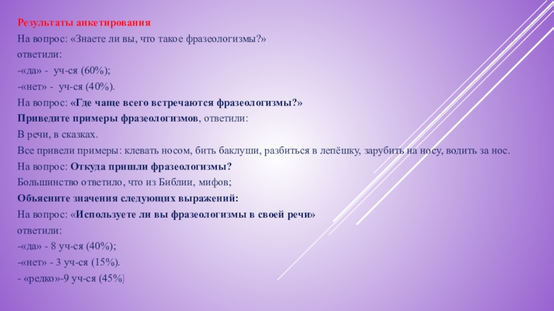 Цель анкетирования: выяснить, знают ли учащиеся, что такое фразеологизмы, часто ли их используют в повседневной речи.