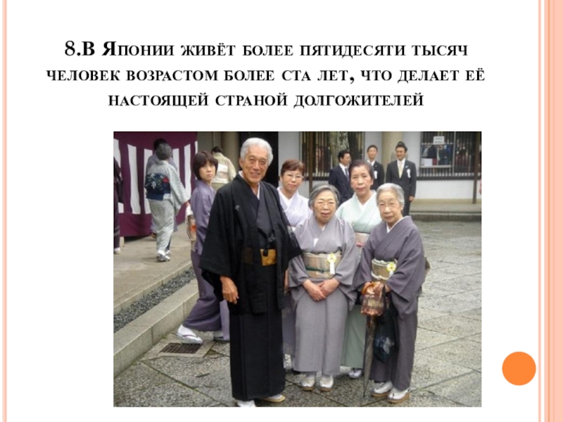 Слайд 168.В Японии живёт более пятидесяти тысяч человек возрастом более ста лет,