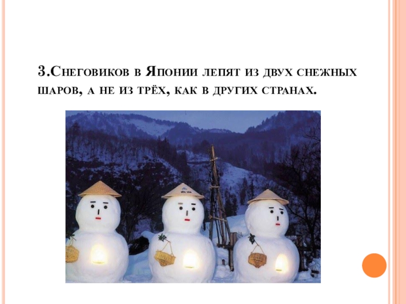 Слайд 113.Снеговиков в Японии лепят из двух снежных шаров, а не из