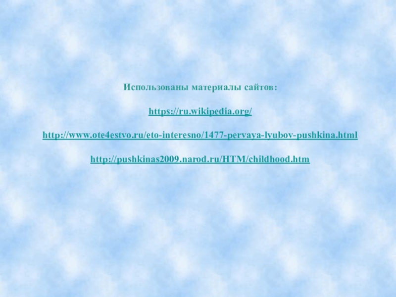 Использованы материалы сайтов:https://ru.wikipedia.org/http://www.ote4estvo.ru/eto-interesno/1477-pervaya-lyubov-pushkina.htmlhttp://pushkinas2009.narod.ru/HTM/childhood.htm