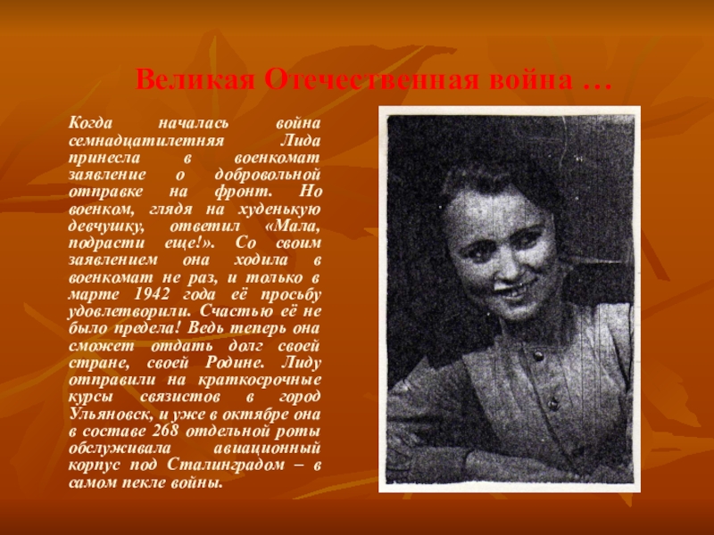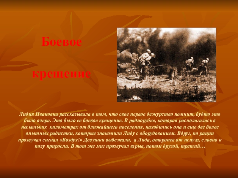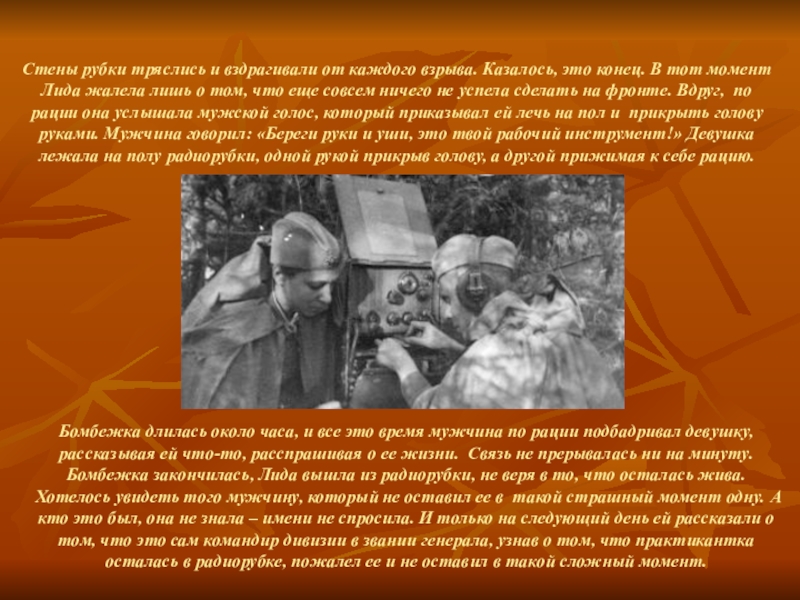 Стены рубки тряслись и вздрагивали от каждого взрыва. Казалось, это конец. В тот момент Лида жалела лишь о том, что еще совсем ничего не успела сделать на фронте. Вдруг, по рации она услышала мужской голос, который приказывал ей лечь на пол и прикрыть голову руками. Мужчина говорил: «Береги руки и уши, это твой рабочий инструмент!» Девушка лежала на полу радиорубки, одной рукой прикрыв голову, а другой прижимая к себе рацию.