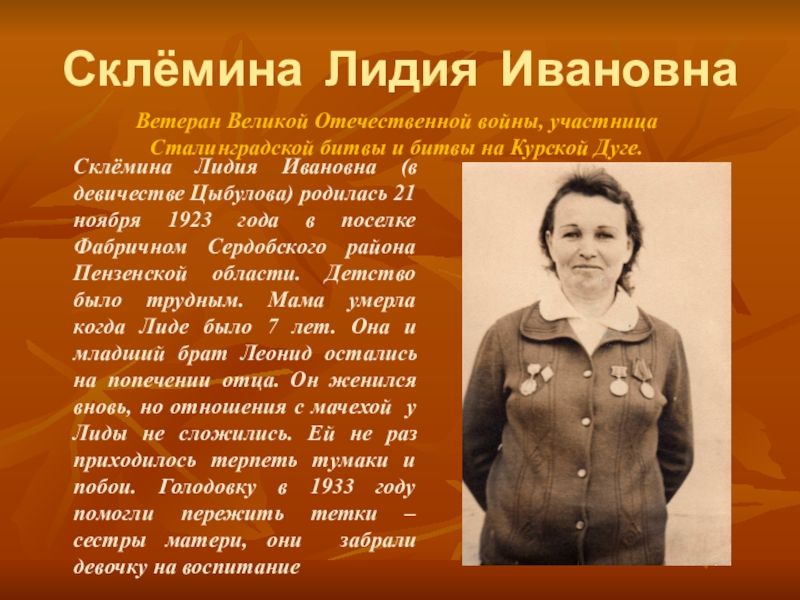 Ветеран Великой Отечественной войны, участница Сталинградской битвы и битвы на Курской Дуге.