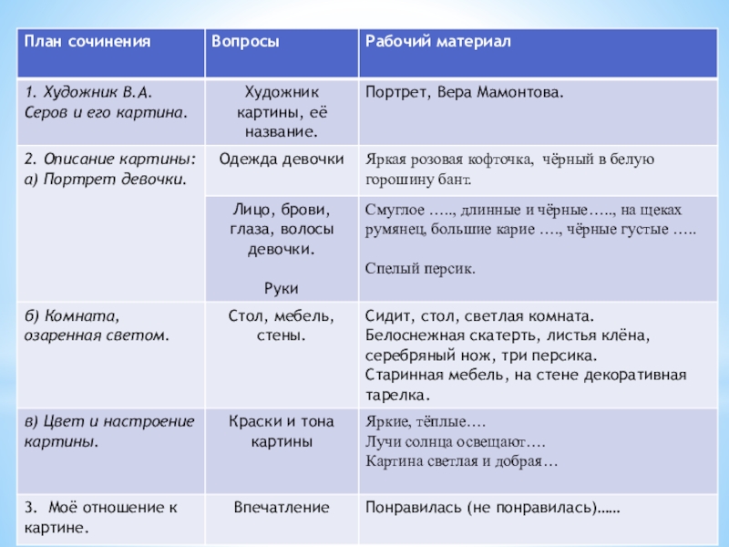 Я думаю, что В.А.Серову удалось передать нежность и обаяние Веры. Мне очень понравилась эта картина и я еще больше хочу узнать о творчестве художника.