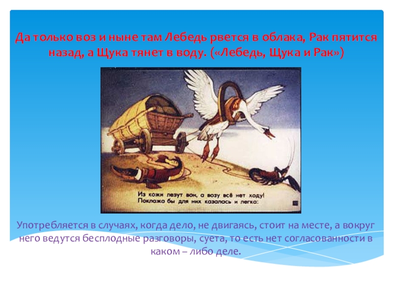 Употребляется в случаях, когда дело, не двигаясь, стоит на месте, а вокруг него ведутся бесплодные разговоры, суета, то есть нет согласованности в каком – либо деле.