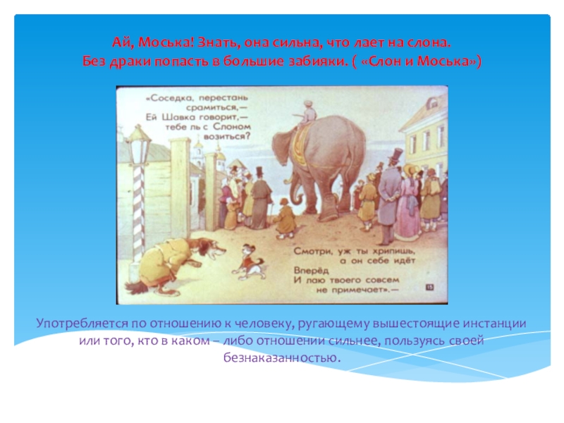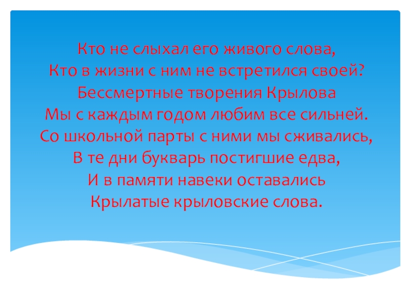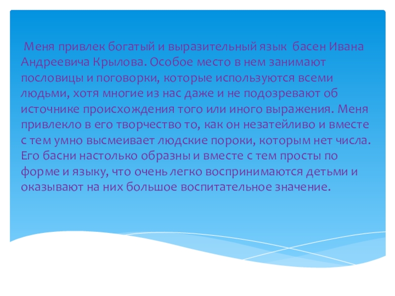 Но еще замечательнее то, что собственные стихи Крылова, легко запоминаясь, сами стали пословицами, вошли в народную речь. Таких пословиц и поговорок из его басен осталось в русском языке много.