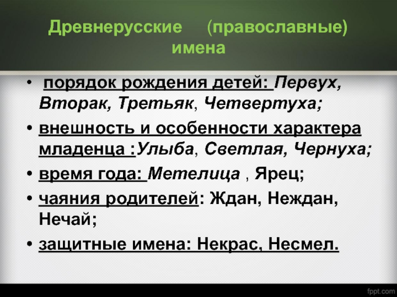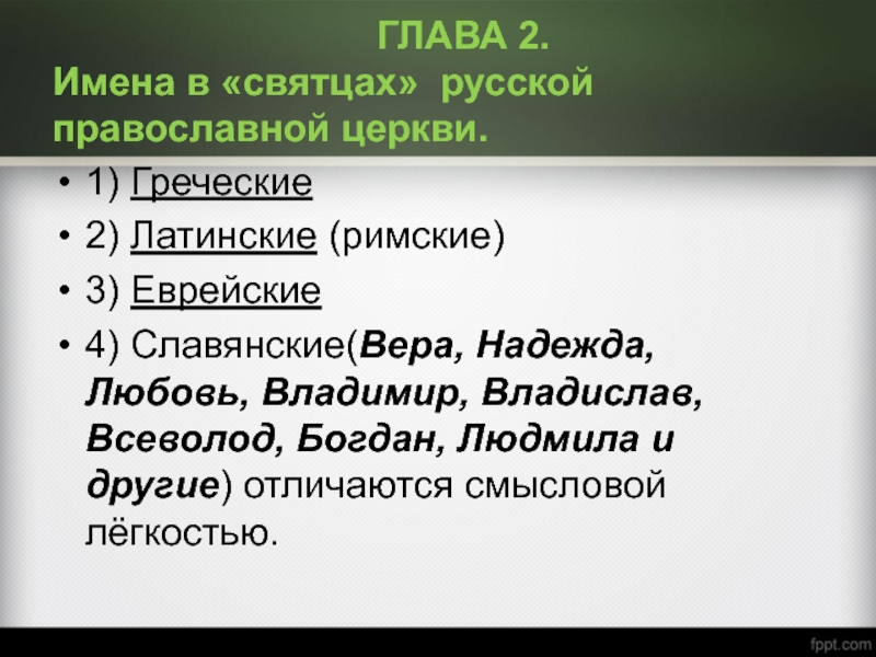 4) Славянские(Вера, Надежда, Любовь, Владимир, Владислав, Всеволод, Богдан, Людмила и другие) отличаются смысловой лёгкостью.
