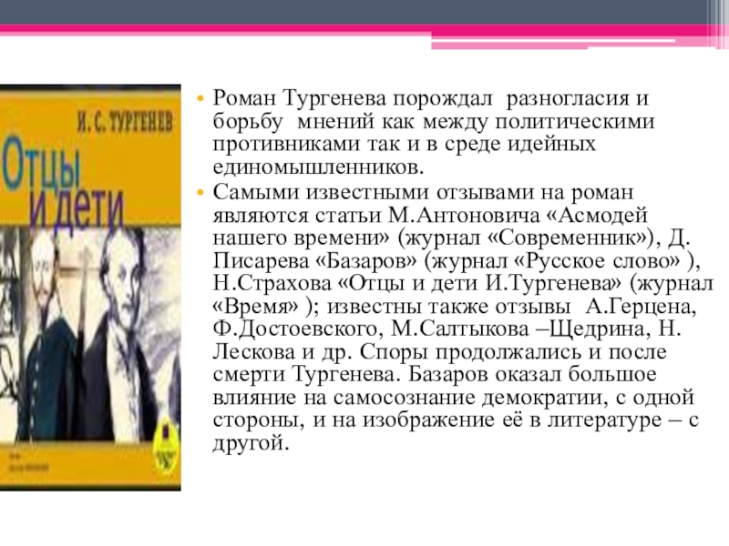 Слайд 8Роман Тургенева порождал разногласия и борьбу мнений как между политическими противниками