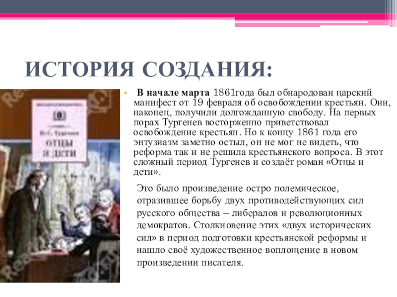 об освобождении крестьян. Они, наконец, получили долгожданную свободу. На первых порах Тургенев восторженно приветствовал освобождение крестьян. Но к концу 1861 года его энтузиазм заметно остыл, он не мог не видеть, что реформа так и не решила крестьянского вопроса. В этот сложный период Тургенев и создаёт роман «Отцы и дети».