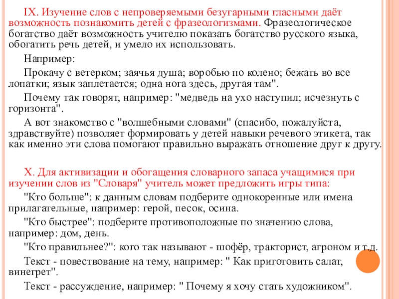 Слайд 11IX. Изучение слов с непроверяемыми безугарными гласными даёт возможность познакомить детей