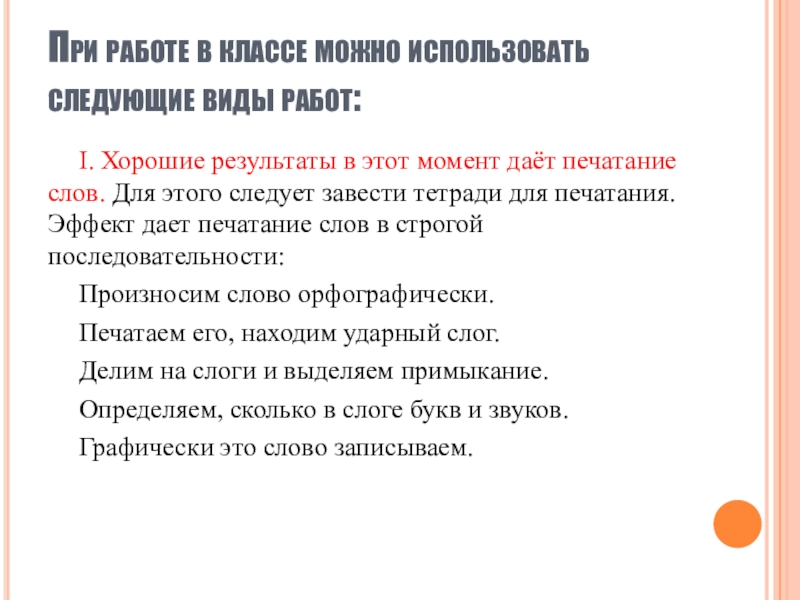 результаты в этот момент даёт печатание слов. Для этого следует завести тетради для печатания. Эффект дает печатание слов в строгой последовательности: