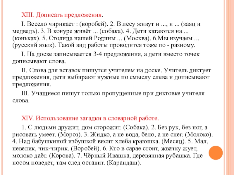 и ..., и ... (заяц и медведь). 3. В конуре живёт ... (собака). 4. Дети катаются на ... (коньках). 5. Столица нашей Родины ... (Москва). 6.Мы изучаем ... (русский язык). Такой вид работы проводится тоже по - разному.