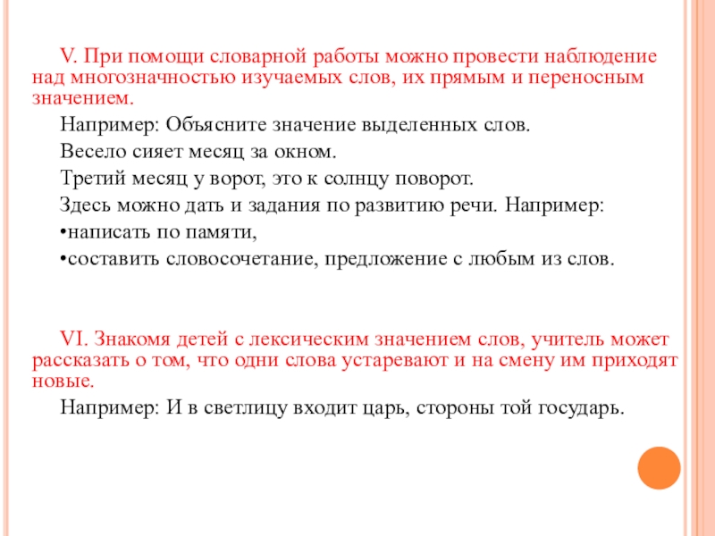 Слайд 9V. При помощи словарной работы можно провести наблюдение над многозначностью изучаемых