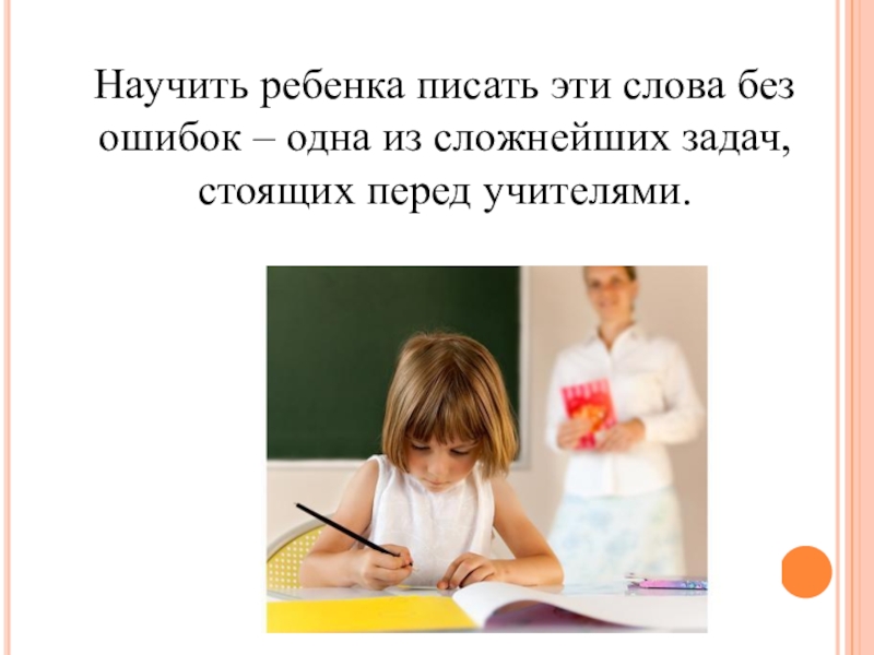 Слайд 3Научить ребенка писать эти слова без ошибок – одна из сложнейших