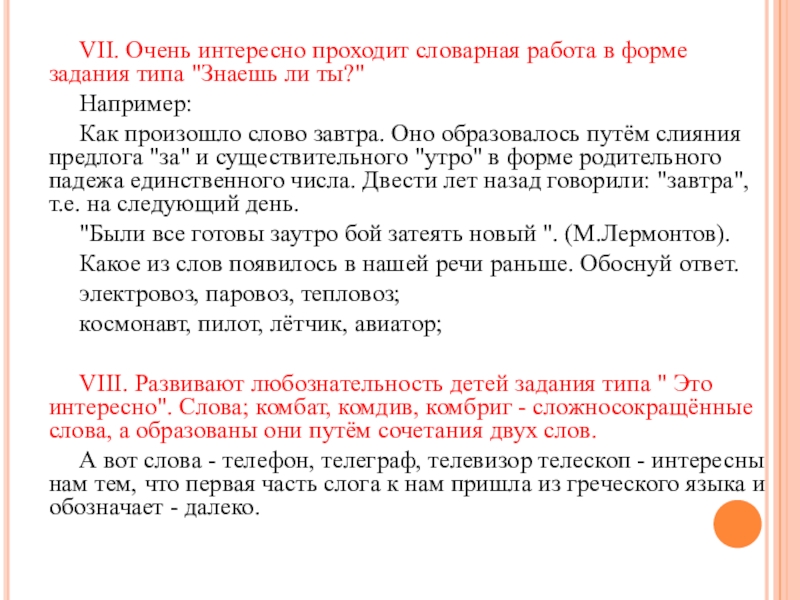 VIII. Развивают любознательность детей задания типа " Это интересно". Слова; комбат, комдив, комбриг - сложносокращённые слова, а образованы они путём сочетания двух слов.