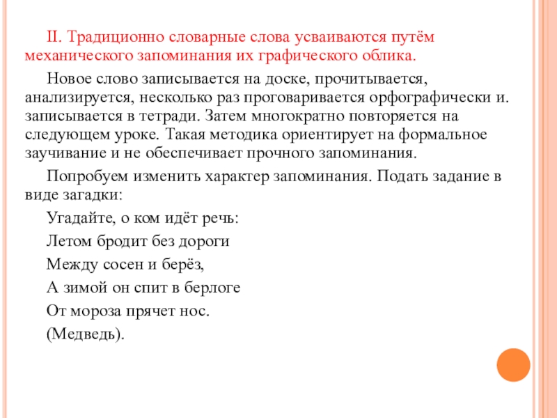 Слайд 6II. Традиционно словарные слова усваиваются путём механического запоминания их графического облика.