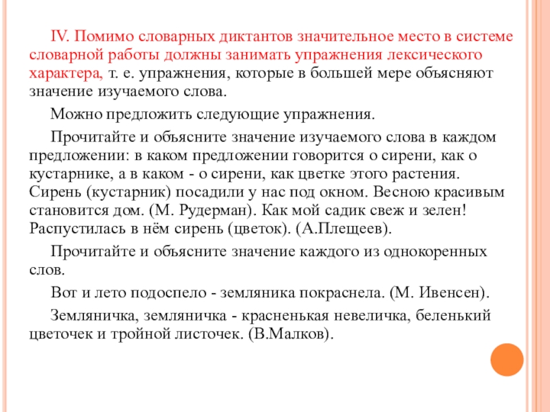 Слайд 8IV. Помимо словарных диктантов значительное место в системе словарной работы должны