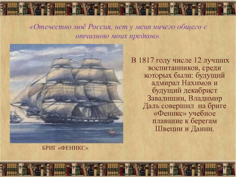 В 1817 году числе 12 лучших воспитанников, среди которых были: будущий адмирал Нахимов и будущий декабрист Завалишин, Владимир Даль совершил на бриге «Феникс» учебное плавание к берегам Швеции и Дании.