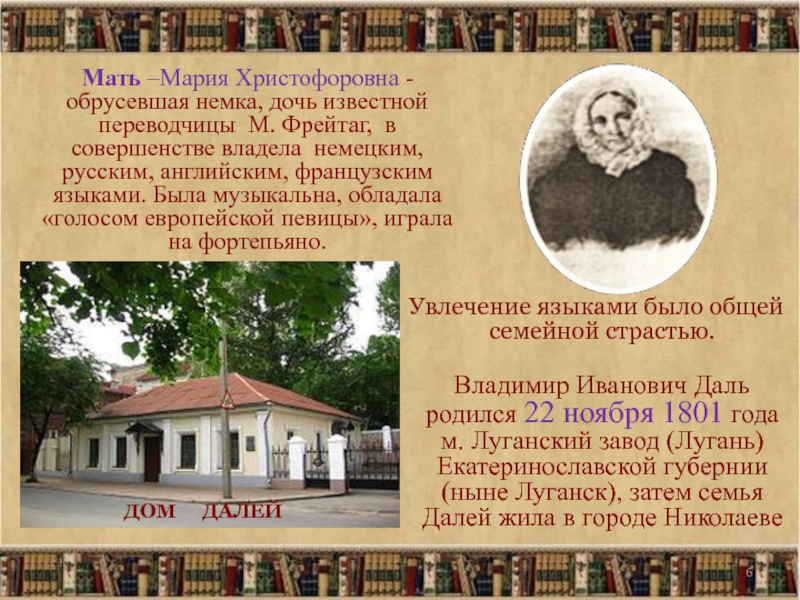 Владимир Иванович Даль родился 22 ноября 1801 года м. Луганский завод (Лугань) Екатеринославской губернии (ныне Луганск), затем семья Далей жила в городе Николаеве