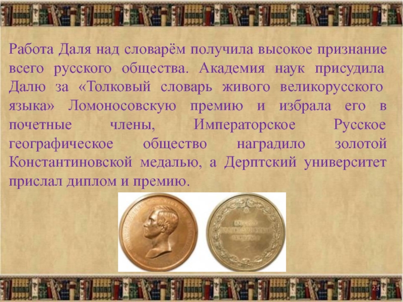 Слайд 23Работа Даля над словарём получила высокое признание всего русского общества. Академия