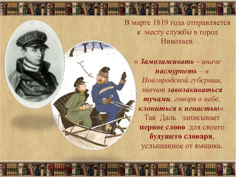 « Замолаживать – иначе пасмурнеть – в Новгородской губернии, значит заволакиваться тучами, говоря о небе, клониться к ненастью». Так Даль записывает первое слово для своего будущего словаря, услышанное от ямщика.