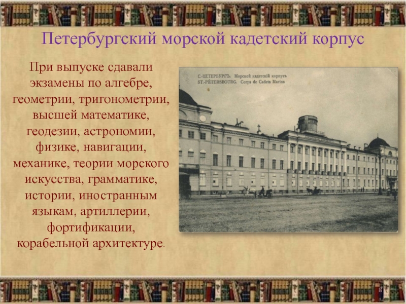 высшей математике, геодезии, астрономии, физике, навигации, механике, теории морского искусства, грамматике, истории, иностранным языкам, артиллерии, фортификации, корабельной архитектуре.