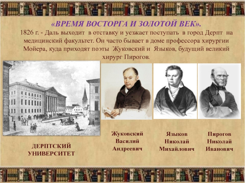 отставку и уезжает поступать в город Дерпт на медицинский факультет. Он часто бывает в доме профессора хирургии Мойера, куда приходят поэты Жуковский и Языков, будущий великий хирург Пирогов.