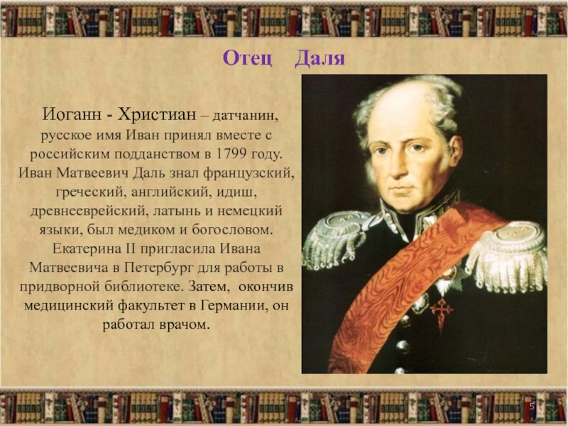принял вместе с российским подданством в 1799 году. Иван Матвеевич Даль знал французский, греческий, английский, идиш, древнееврейский, латынь и немецкий языки, был медиком и богословом. Екатерина II пригласила Ивана Матвеевича в Петербург для работы в придворной библиотеке. Затем, окончив медицинский факультет в Германии, он работал врачом.