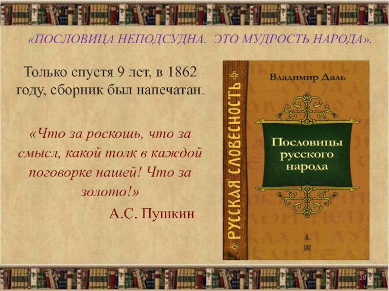 Слайд 20«ПОСЛОВИЦА НЕПОДСУДНА. ЭТО МУДРОСТЬ НАРОДА».