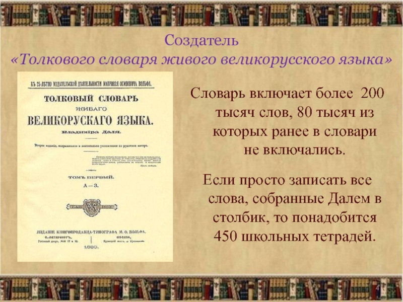 Если просто записать все слова, собранные Далем в столбик, то понадобится 450 школьных тетрадей.