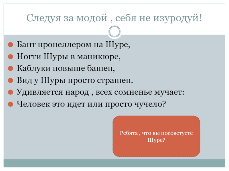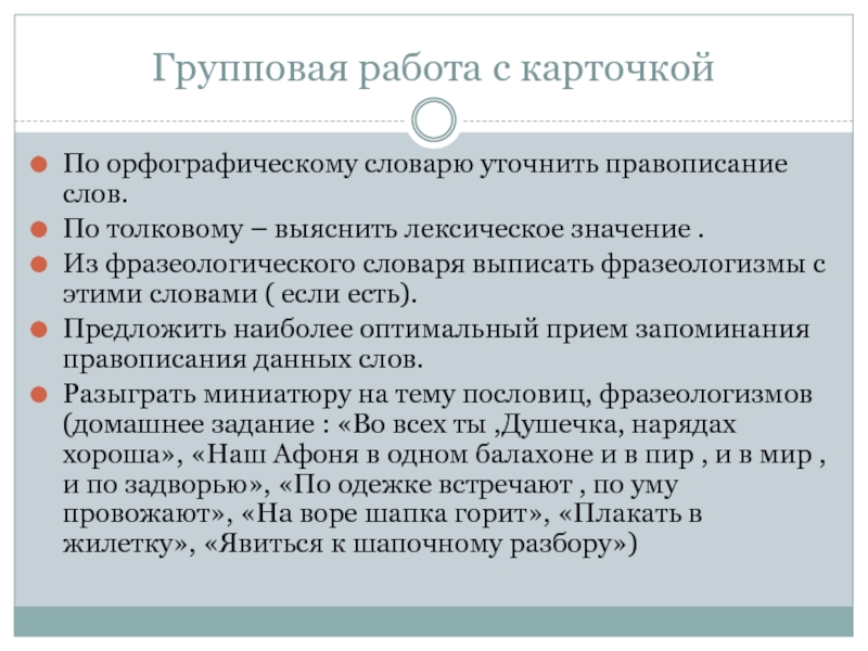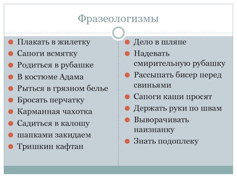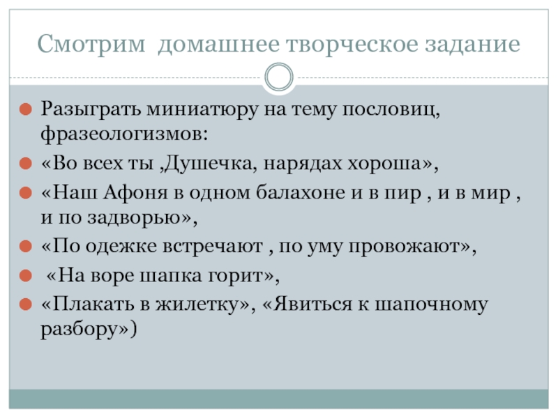 Разыграть миниатюру на тему пословиц, фразеологизмов (домашнее задание : «Во всех ты ,Душечка, нарядах хороша», «Наш Афоня в одном балахоне и в пир , и в мир , и по задворью», «По одежке встречают , по уму провожают», «На воре шапка горит», «Плакать в жилетку», «Явиться к шапочному разбору»)