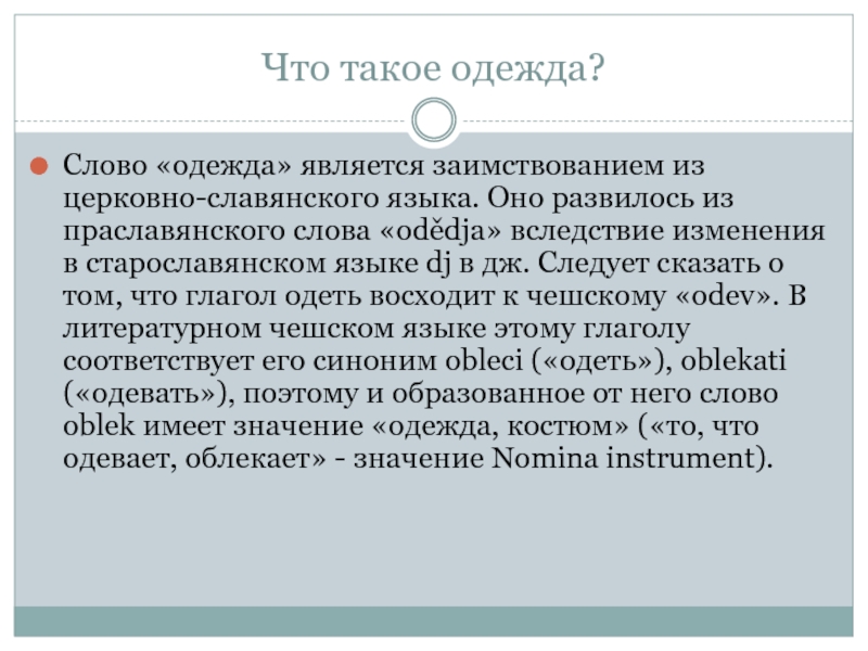 из праславянского слова «odědja» вследствие изменения в старославянском языке dj в дж. Следует сказать о том, что глагол одеть восходит к чешскому «odev». В литературном чешском языке этому глаголу соответствует его синоним obleci («одеть»), oblekati («одевать»), поэтому и образованное от него слово oblek имеет значение «одежда, костюм» («то, что одевает, облекает» - значение Nomina instrument).