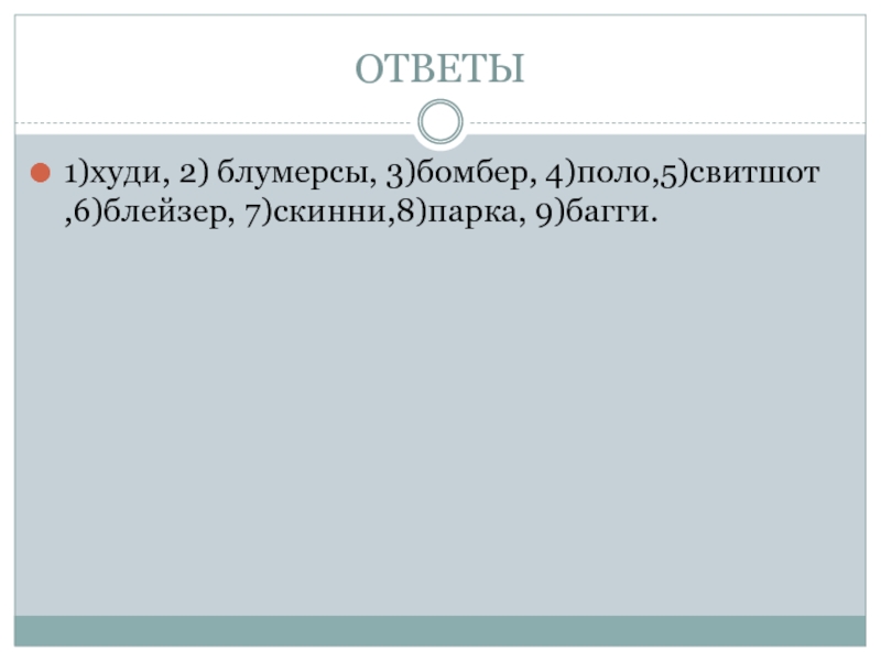 1)худи, 2) блумерсы, 3)бомбер, 4)поло,5)свитшот ,6)блейзер, 7)скинни,8)парка, 9)багги.