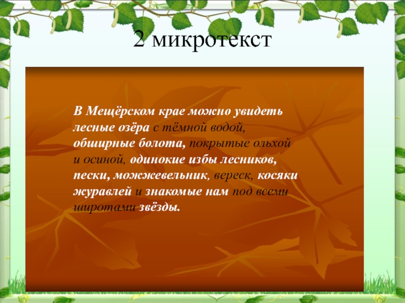 в Мещерском крае; в этой части основные — слова, отражающие разнообразие пейзажа края: луга, боры, озера, стога, болота, ольха, осока, избы, пески, можжевельник, вереск, журавли, звезды — все зримо, осязаемо.