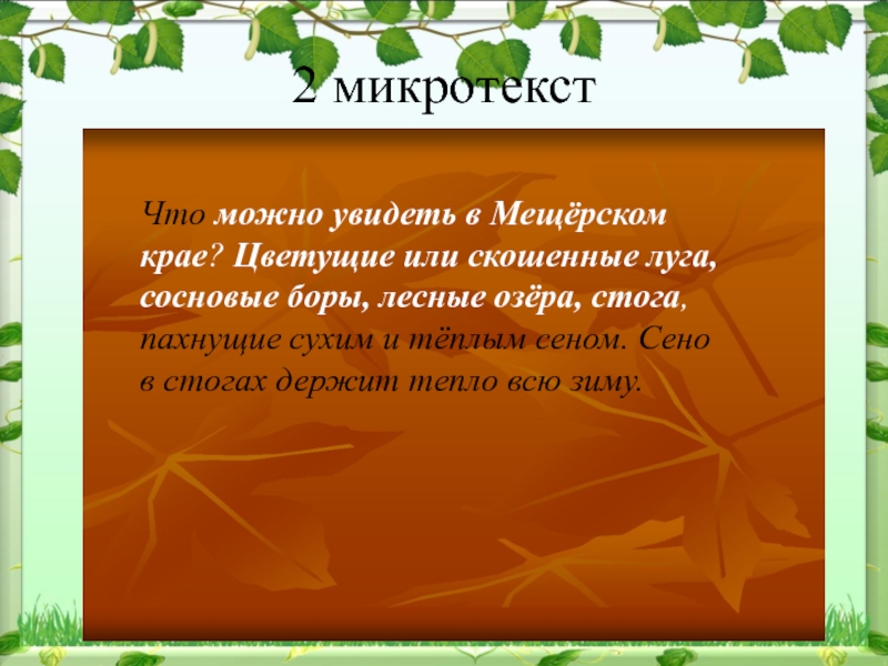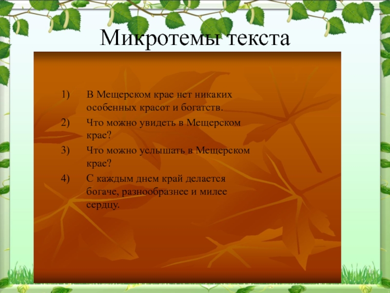 существительные, так как писатель отражает в нем свои мысли и чувства, подводит итоги многолетних наблюдений, раздумий, которые вызывает у него Мещерский край: красота, богатство, притягательная сила, прелесть, разнообразие. Эта часть текста отвечает на вопрос: чем Мещера привлекает писателя?