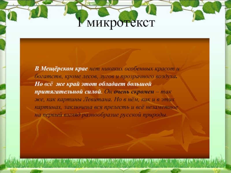 лесов, лугов и прозрачного воздуха. Но всё же край этот обладает большой притягательной силой. Он очень скромен – так же, как картины Левитана. Но в нём, как и в этих картинах, заключена вся прелесть и всё незаметное на первый взгляд разнообразие русской природы.
