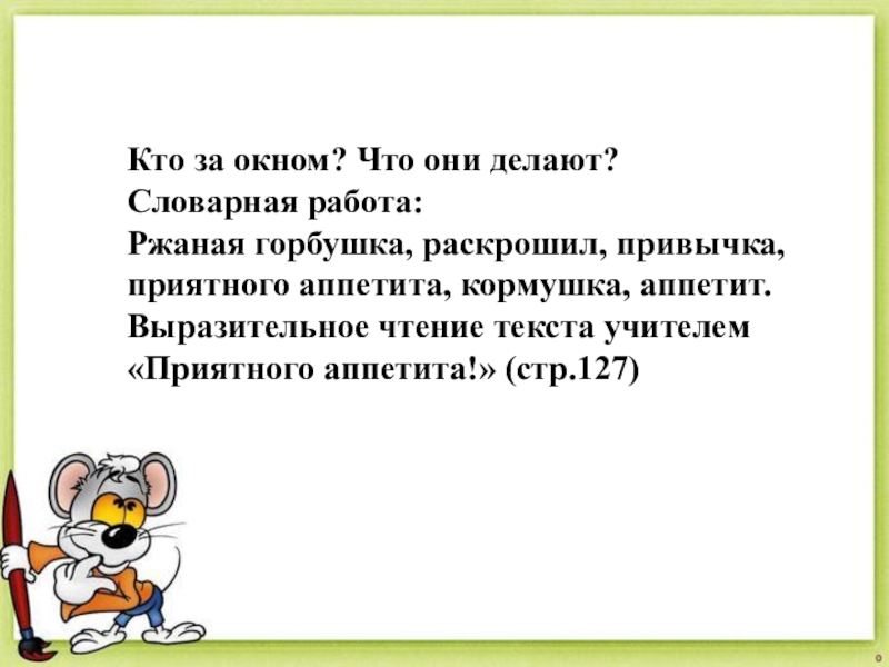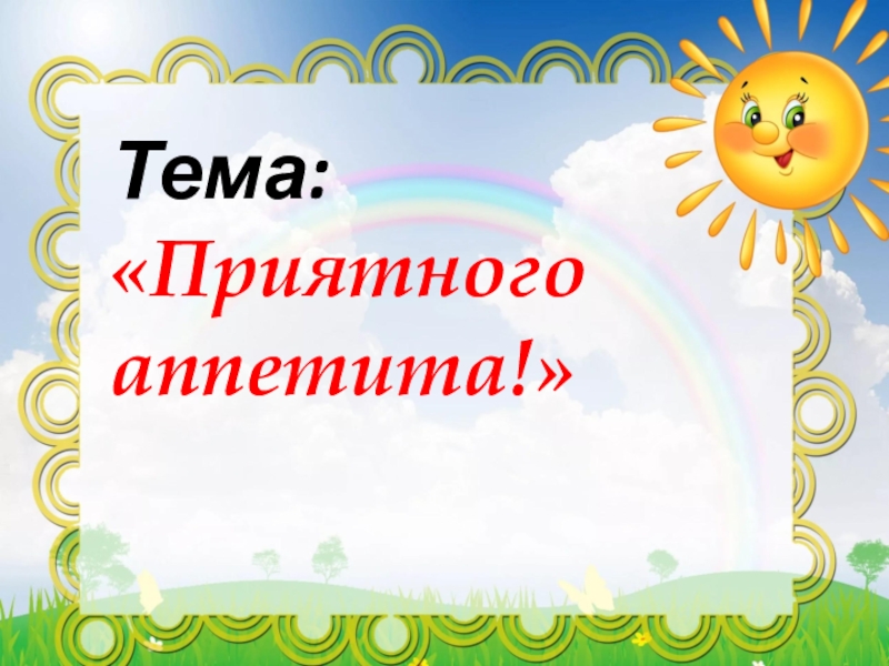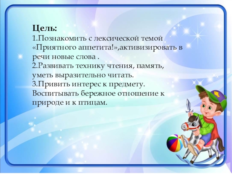 Цель:1.Познакомить с лексической темой «Приятного аппетита!»,активизировать в речи новые слова .2.Развивать технику чтения, память, уметь выразительно читать.3.Привить