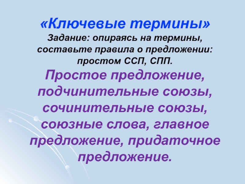 Простое предложение, подчинительные союзы, сочинительные союзы, союзные слова, главное предложение, придаточное предложение.