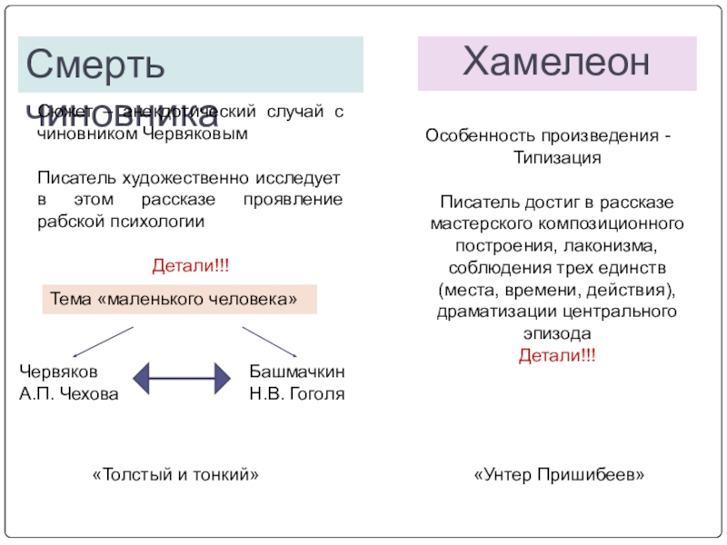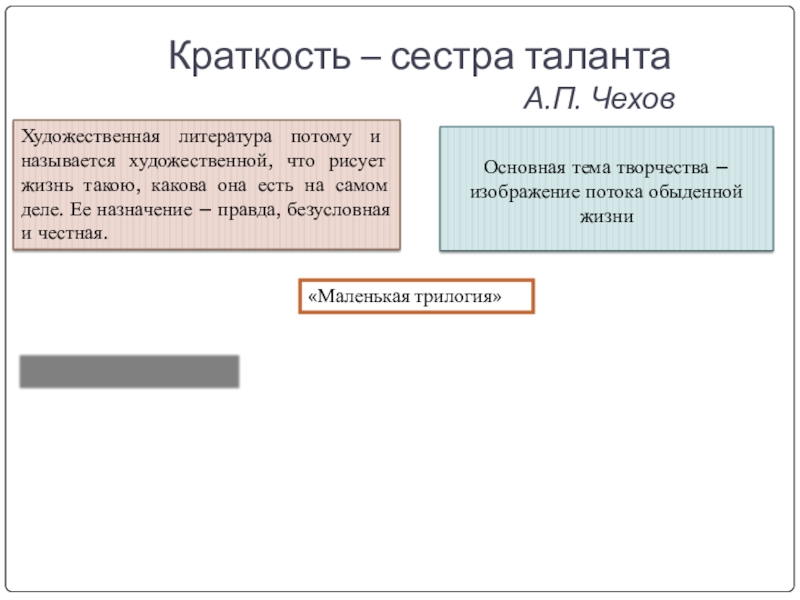 Тема разрушения человеческой личности неоднократно поднимается в рассказах Чехова. Рассказы «Человек в футляре», «Крыжовник» и «О любви» связаны общим сюжетом, идеей, героями. Эти рассказы называют «маленькой трилогией»
