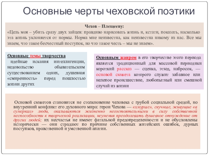 Основой сюжетов становится не столкновение человека с грубой социальной средой, но внутренний конфликт его духовного мира: герои Чехова — «хмурые», скучные, живущие «в сумерках» люди, оказываются жизненно несостоятельными в силу собственной неспособности к творческой реализации, неумения преодолевать душевное отчуждение от других людей; их несчастья не имеют фатальной предопределенности и не обусловлены исторически — они страдают по причине собственных житейских ошибок, дурных поступков, нравственной и умственной апатии.