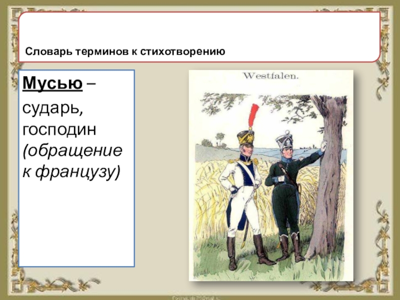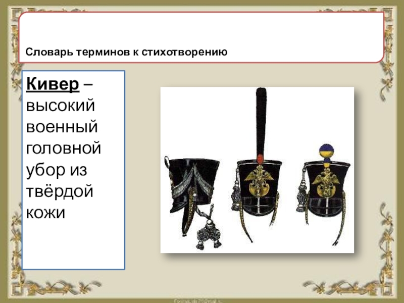 Слайд 27Кивер – высокий военный головной убор из твёрдой кожи