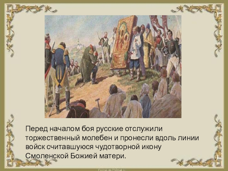 Слайд 12Перед началом боя русские отслужили торжественный молебен и пронесли вдоль линии