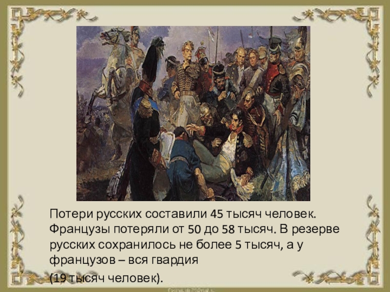 Слайд 17Потери русских составили 45 тысяч человек. Французы потеряли от 50 до