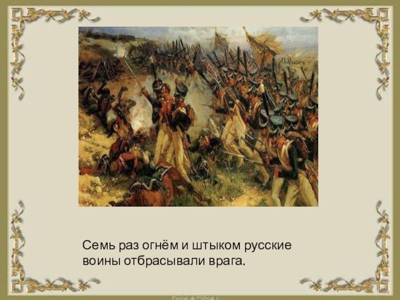 Слайд 14Семь раз огнём и штыком русские воины отбрасывали врага.