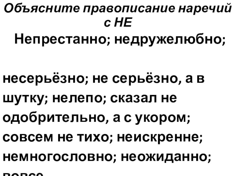 Объясните правописание наречий с НЕ	Непрестанно; недружелюбно;	несерьёзно; не серьёзно, а в шутку; нелепо; сказал не одобрительно, а с