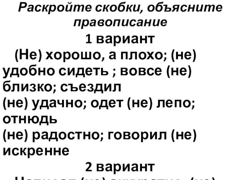 Раскройте скобки, объясните правописание1 вариант	(Не) хорошо, а плохо; (не) удобно сидеть ; вовсе (не) близко; съездил (не)