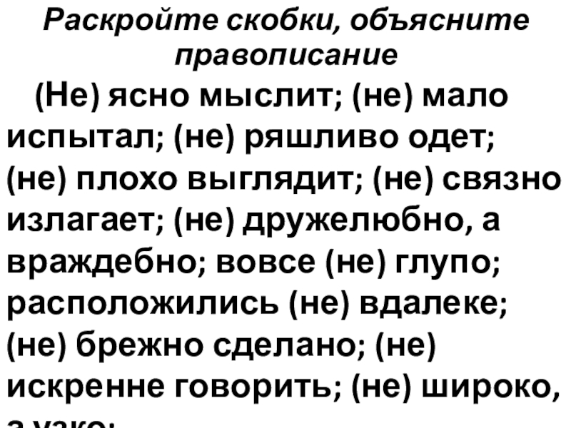Раскройте скобки, объясните правописание	(Не) ясно мыслит; (не) мало испытал; (не) ряшливо одет; (не) плохо выглядит; (не) связно