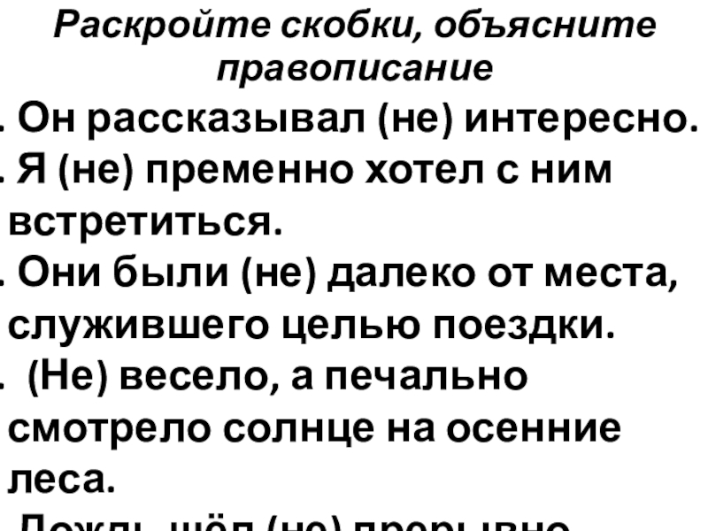 Раскройте скобки, объясните правописание Он рассказывал (не) интересно. Я (не) пременно хотел с ним встретиться. Они были