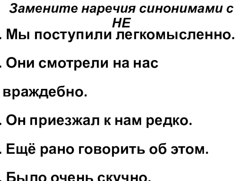 Замените наречия синонимами с НЕ Мы поступили легкомысленно. Они смотрели на нас враждебно. Он приезжал к нам