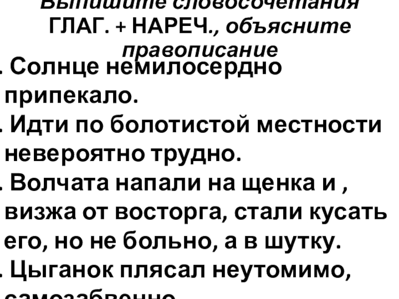 Слайд 11Выпишите словосочетания ГЛАГ. + НАРЕЧ., объясните правописание